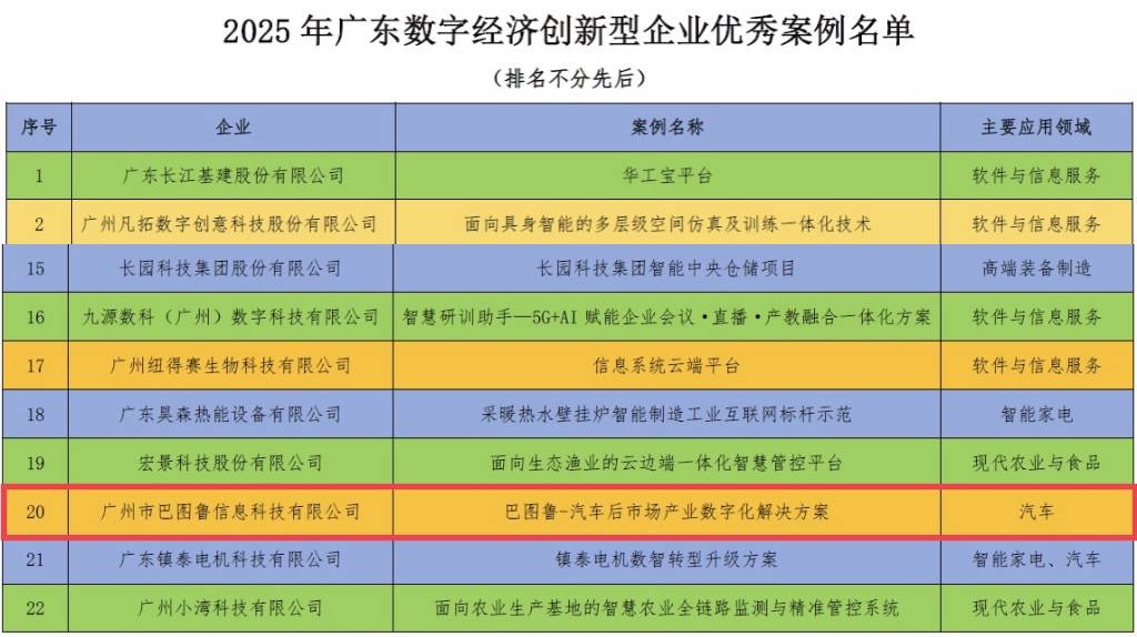近日,广东省数字产业联合会正式发布2025年广东数字经济创新型企业优秀案例名单。根据《广东省数字产业联合会专家委员会评审细则》及《广东民营企业数字经济优秀案例评分体系》,经专家严格评审,全省共遴选出22家优秀企业案例。广州市巴图鲁信息科技有限公司凭借“巴图鲁-汽车后市场产业数字化解决方案”二次入选该名单!